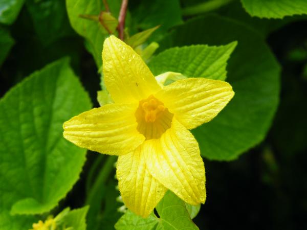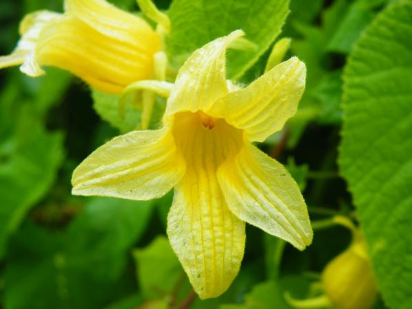 Thladiantha dubia Antropofit zadomowiony. Łodyga wijąca się. Liście sercowate, ząbkowane, lekko owłosione. Szypułki odstająco owłosione, kwiaty kieliszkowate, żóte, listki okrywy wąskie, odgięte w dół. Kwitnie: czerwiec - sierpień.