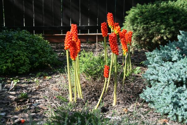 Roślina kwitnie na przełomie sierpnia i września w postaci kolb.W pażdzierniku kolby znikają i pojawiają się liście które rosną całą zimę aż do okresu kwitnienia.