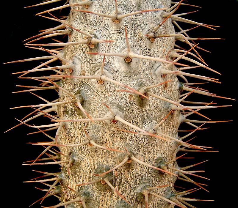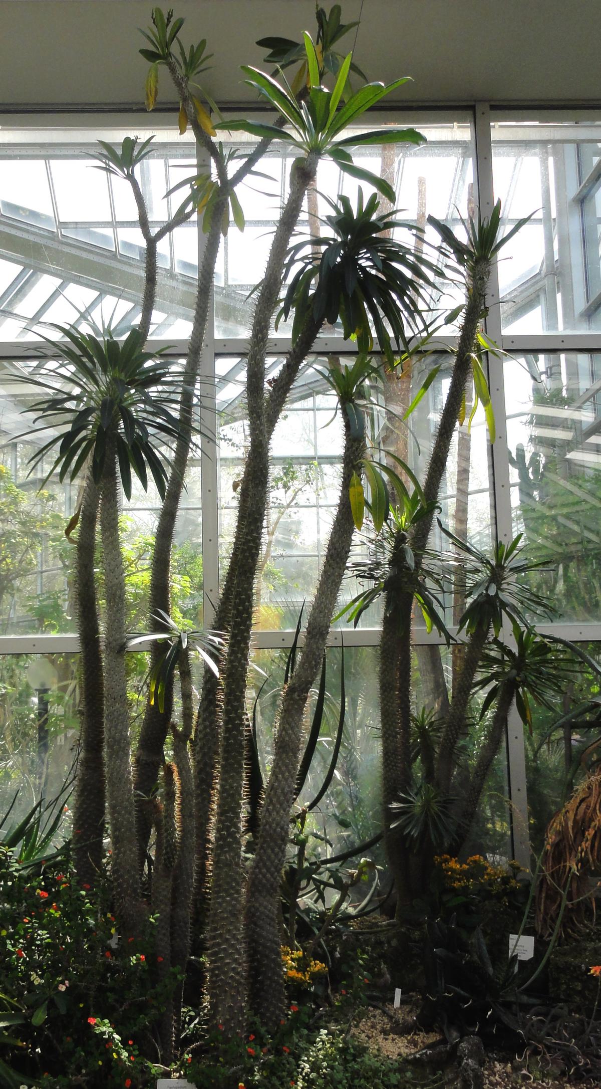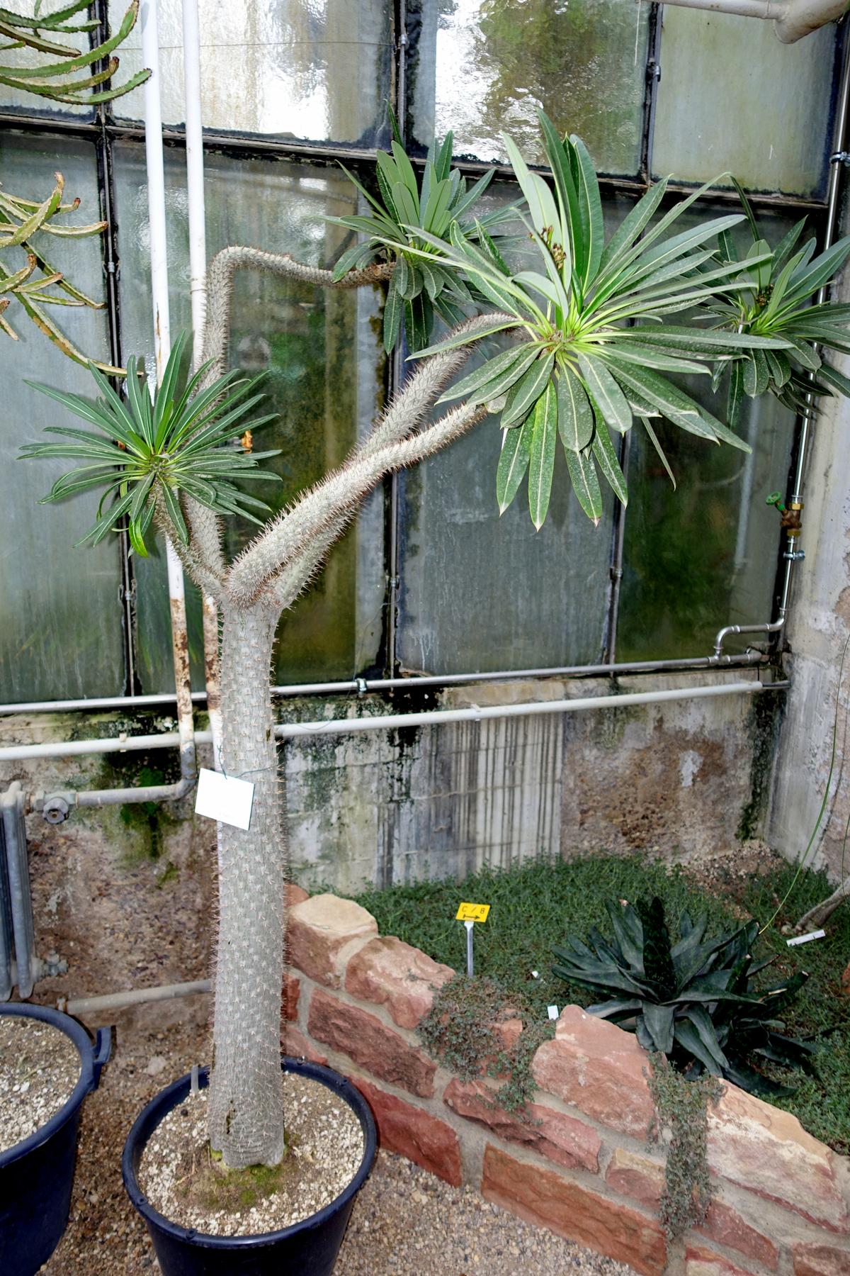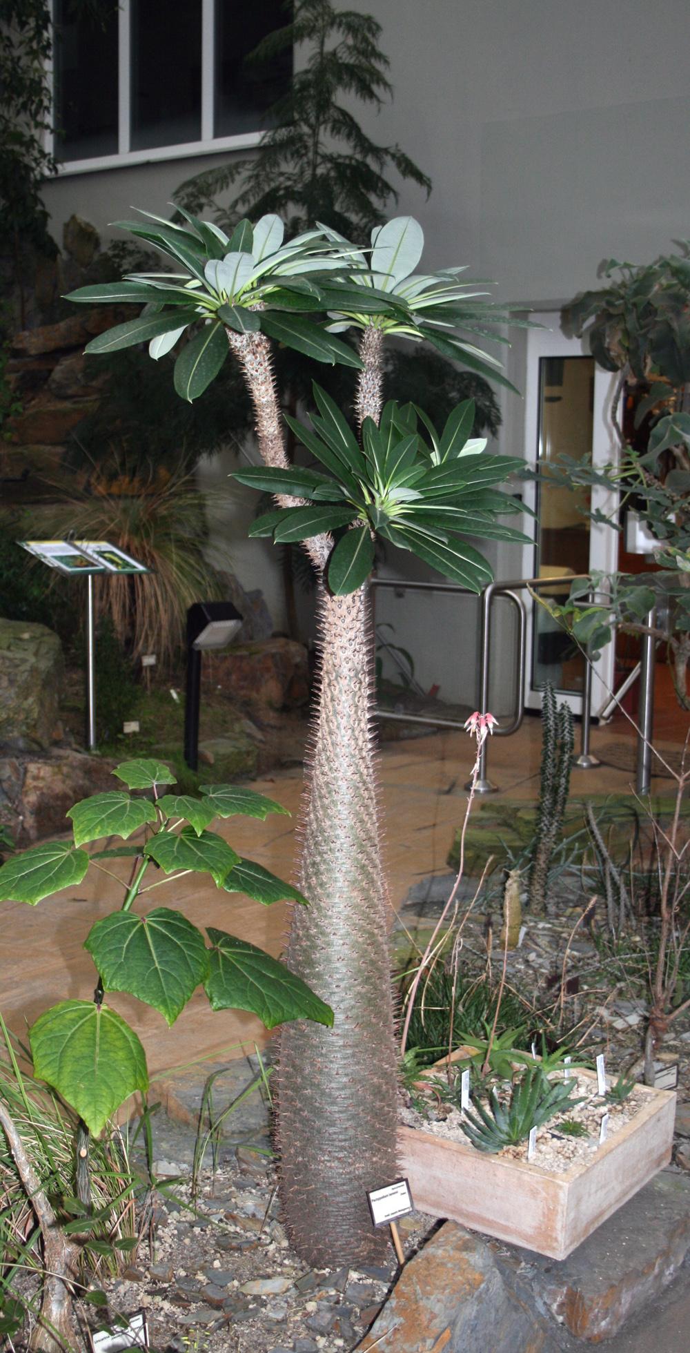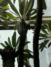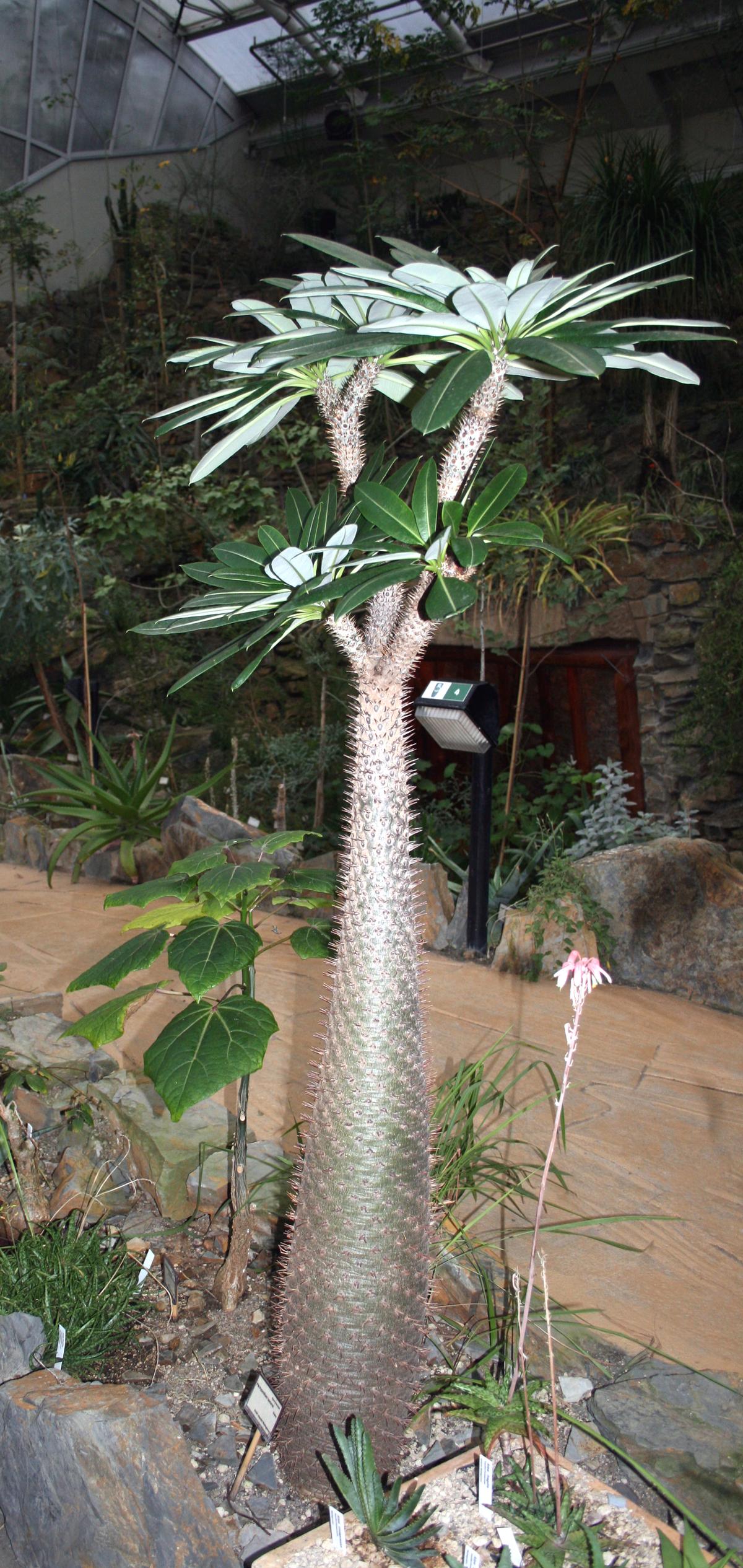 Sukulent przypominający przedstawicieli kaktusowatych – ma gruby pień najeżony kolcami. Z pnia wyrastają długie, ciemnozielone liście, które zrzucane są w okresie zimy. Na wiosnę liście znów się rozwijają. Liście dochodzą do 40 cm długości i 11 cm szerokości. Kwitnie bardzo rzadko, pojawiają się wówczas niewielkie białe kwiaty.