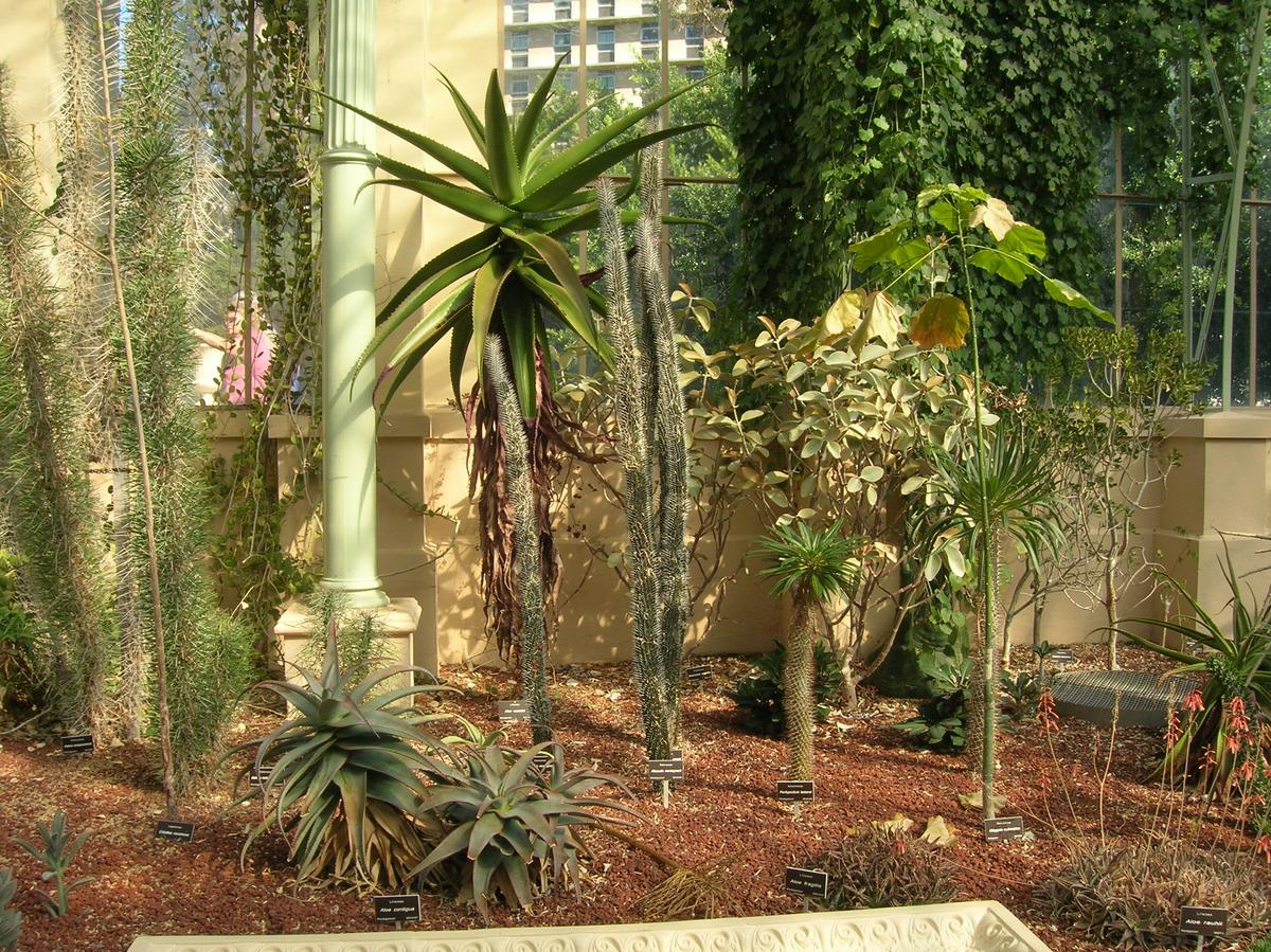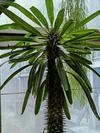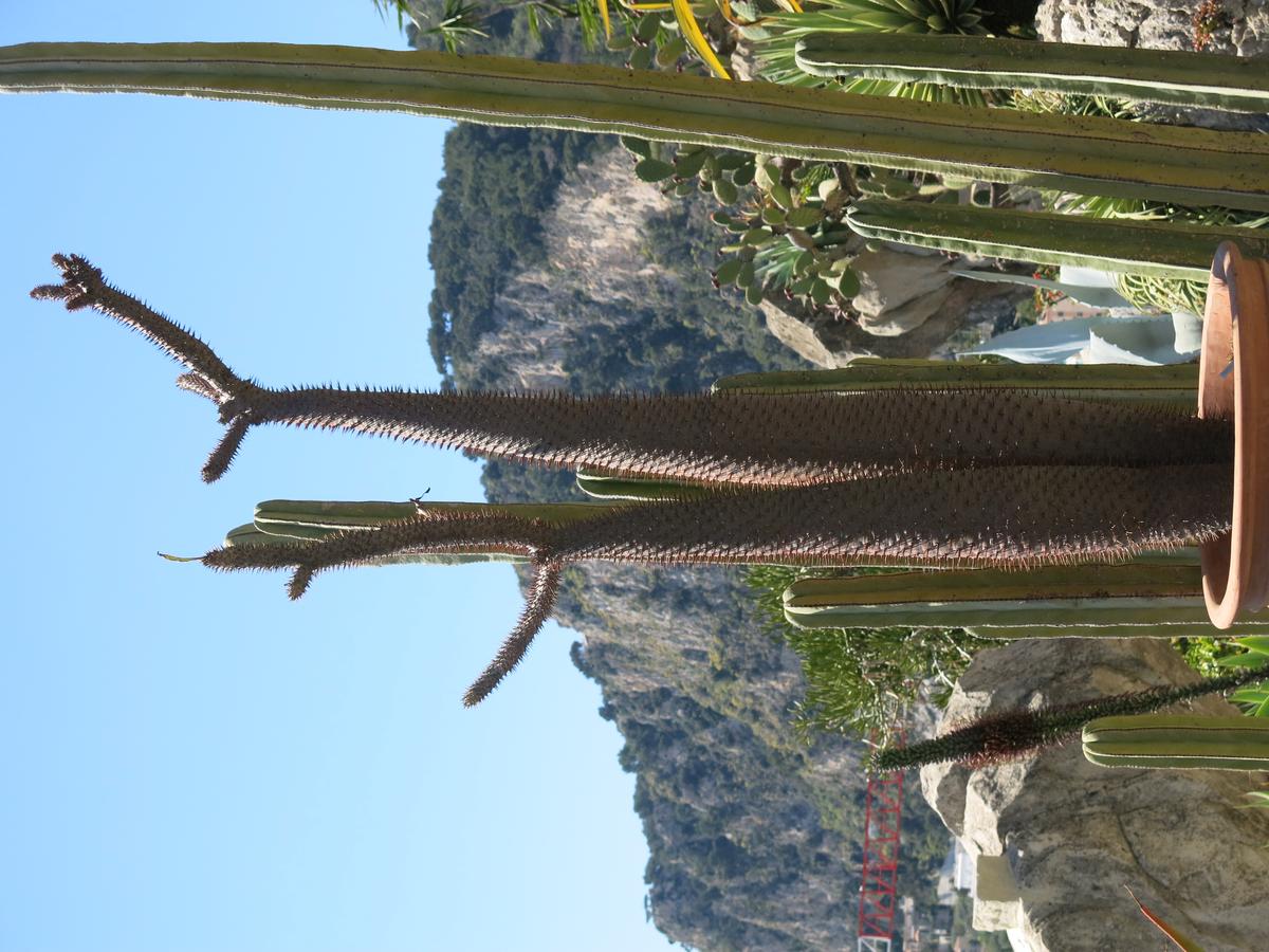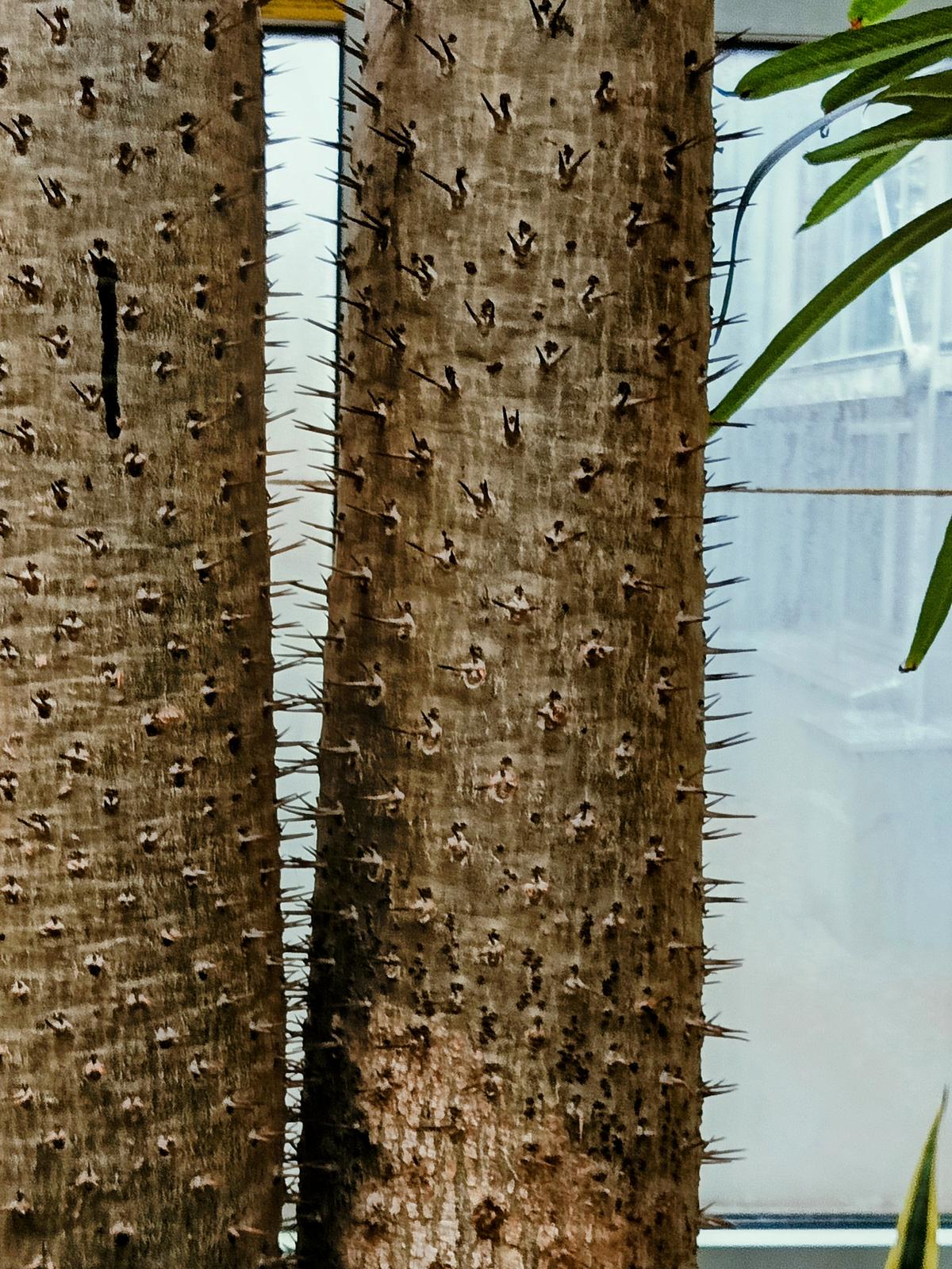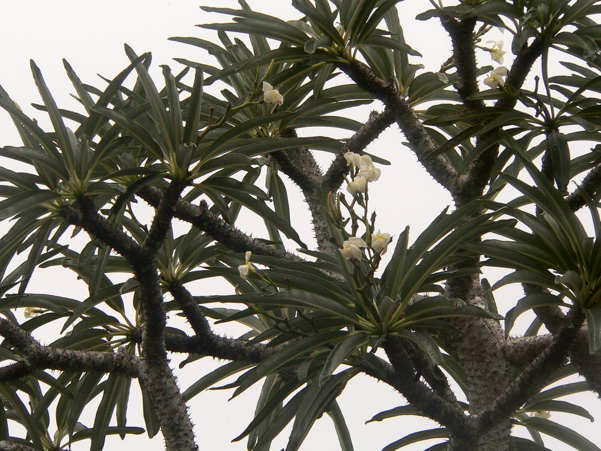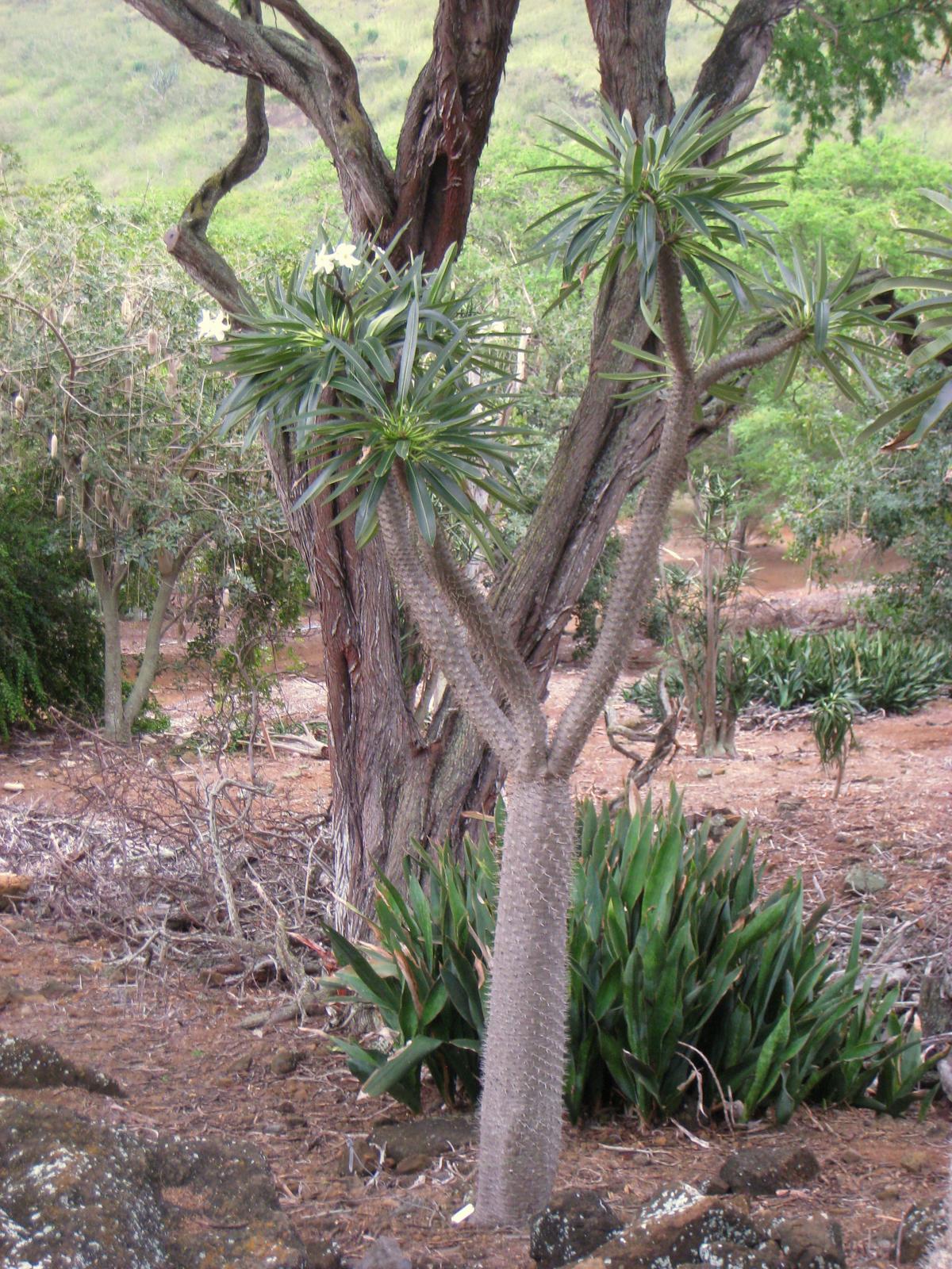 Sukulent przypominający przedstawicieli kaktusowatych – ma gruby pień najeżony kolcami. Z pnia wyrastają długie, ciemnozielone liście, które zrzucane są w okresie zimy. Na wiosnę liście znów się rozwijają. Liście dochodzą do 40 cm długości i 11 cm szerokości. Kwitnie bardzo rzadko, pojawiają się wówczas niewielkie białe kwiaty.