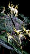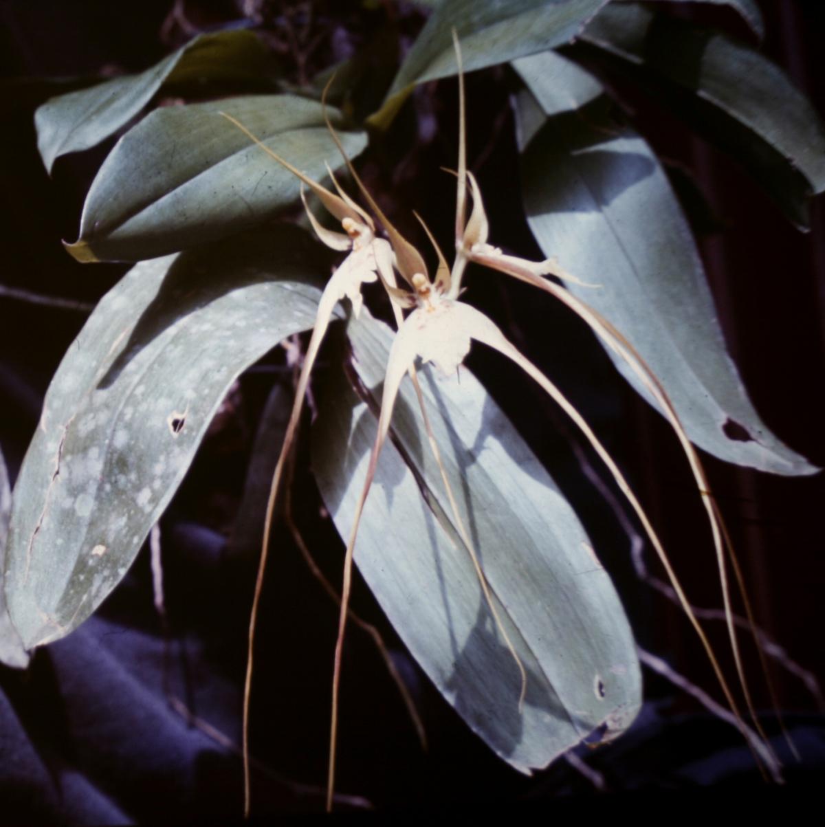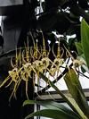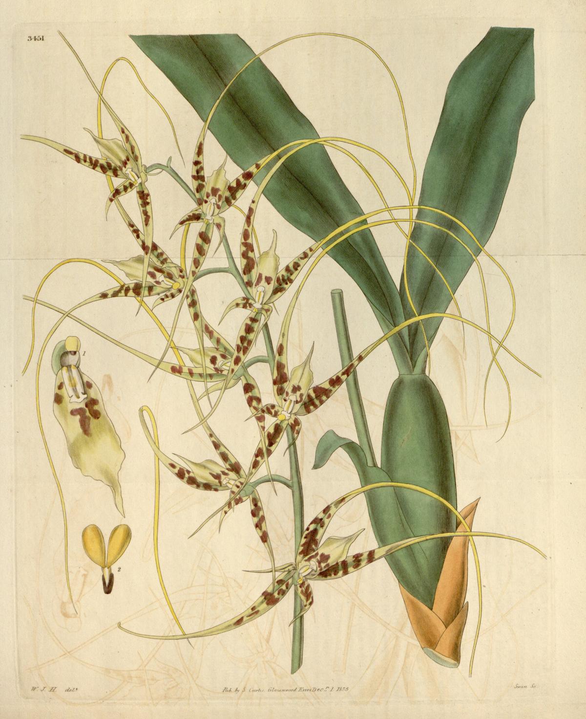 Pseudobulwy, o równowąskim do podłużnie eliptycznego kształcie, osiągają około 14 cm długości i 3,5 cm szerokości, są spłaszczone i mają ostre krawędzie. Każda pseudobulwa wytwarza dwa (rzadziej trzy) liście. Liście mają kształt od językowatego do eliptyczno-podługowatego, osiągając 16–27 cm długości i 2,5–8 cm szerokości. Kwiatostan boczny, osiąga do 45-50 cm długości i może zawierać do 20 kwiatów o długości 15 cm i 3,75 cm szerokości. Kwiaty są pachnące i długotrwałe. Okwiat żółty do żółto-pomarańczowego lub żółtozielonego z czerwono-brązowymi plamkami na wszystkich listkach. Rośliny kwitną od stycznia do sierpnia, szczyt kwitnienia przypada na kwiecień i maj. Kształt kwiatu przypomina wygląd pająków, co stanowi mechanizm mimetyczny służący roślinie do wabienia określonych gatunków os, które atakują kwiat, sądząc, że jest to pajęczak, i w ten sposób mimowolnie go zapylają.