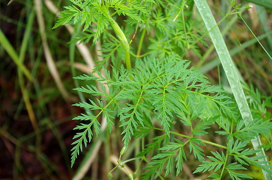 Liście pochwy liściowe rozdęte, górne szerokie, dolne wąskie, słabo obłonione. Blaszka w ogólnym zarysie trójkątna lub trójkątnie rombowa, 2–4 krotnie pierzasta, odcinki ostatniego rzędu pocięte na lancetowate, zaostrzone łatki. Dolne odcinki I rzędu większe od innych i osadzone na ogonkach.