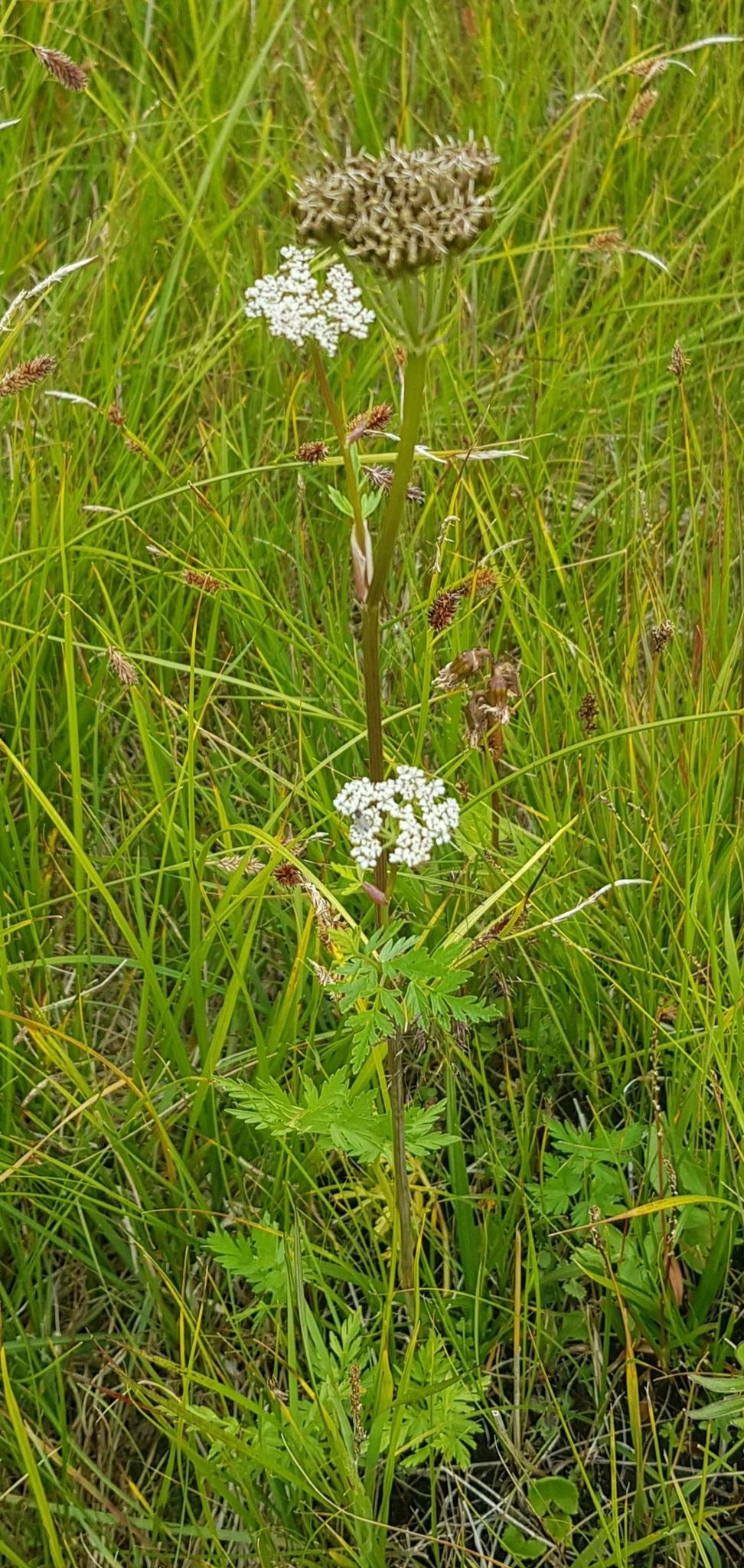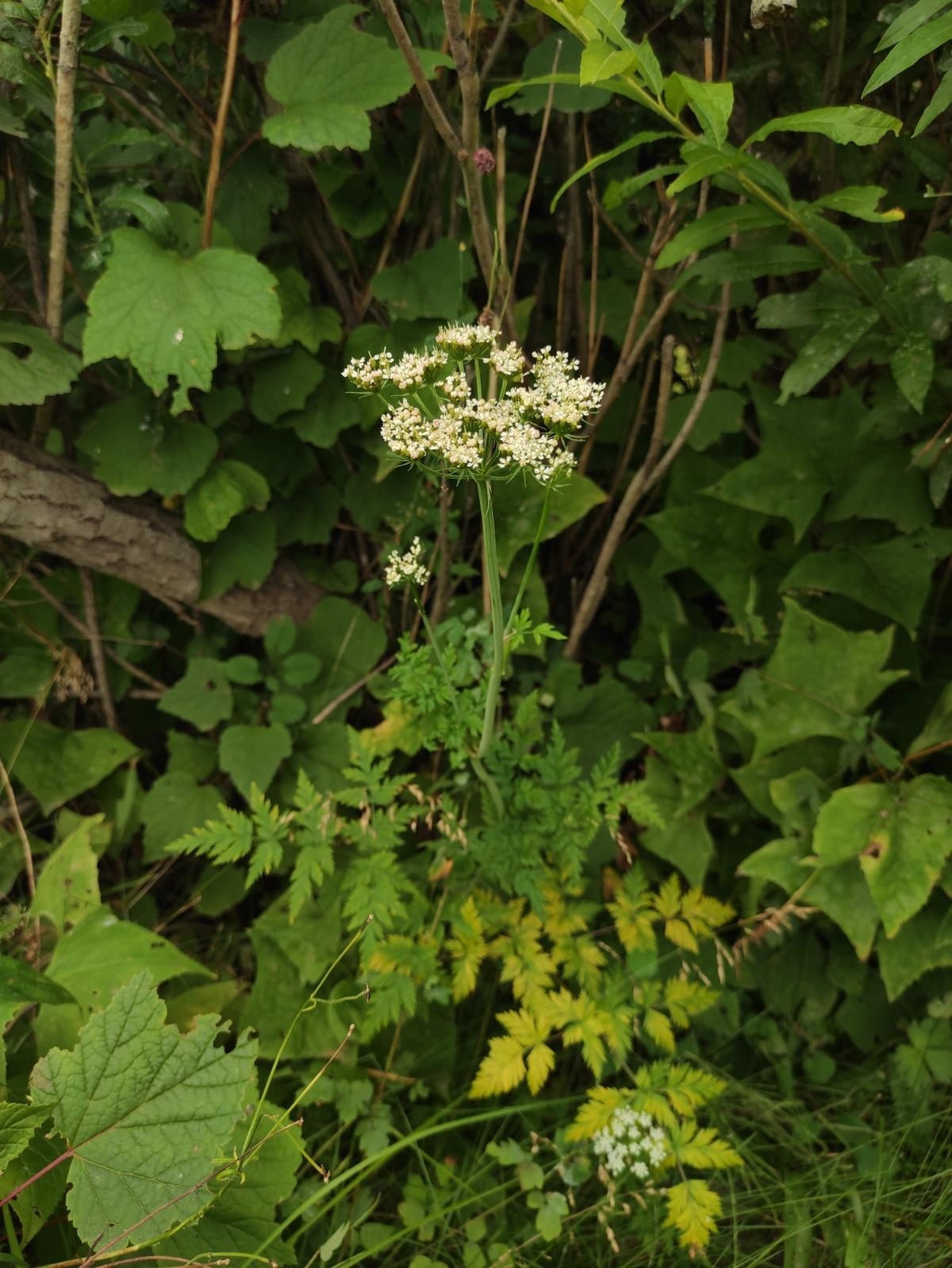 Kwiaty zebrane w baldach złożony z 5–30 baldaszków na długich i szorstkich szypułach. Pokrywy są nieliczne i szybko odpadające lub ich brak. Pokrywki są liczne, nitkowate i dłuższe od szypułek kwiatowych. Kwiaty o ząbkach kielicha niewyraźnych i płatkach korony zielonawobiaławych lub brudnobiaławych. Płatki odwrotnie jajowate lub odwrotnie sercowate na szczycie są wycięte, w wycięciu z łatką zagiętą do środka.