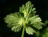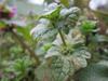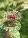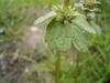 Liście ulistnienie naprzeciwległe, liście nierówno, tępo karbowane, spodem nagie, na górnej powierzchni mają krótkie włoski. Dolne liście na ogonkach, sercowatookrągłe, górne siedzące i obejmujące na wpół łodygę, okrągłe i wcinano karbowane. Roślina nie wydziela silnej woni, czym różni się od podobnego gatunku – jasnoty purpurowej.
