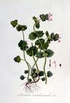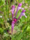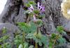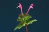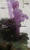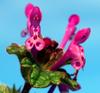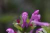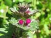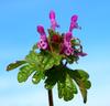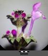 Kwiaty bladopurpurowe, wyrastają w okółkach w kątach liści na szczycie łodygi. Mają wyraźnie grzbiecistą, dwuwargową budowę, przy czym warga górna jest ciemniejsza, dolna jest plamista. Korona kwiatu o długości do 2 cm, o rurce dużo dłuższej od kielicha, który jest trwały, zrosłodziałkowy. Rurka korony wewnątrz nie posiada włosków. Kwiaty równoczesne lub słabo przedprątne, owadopylne.