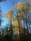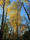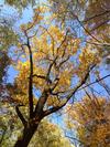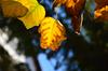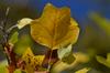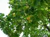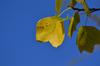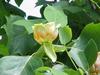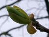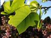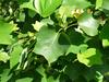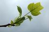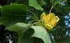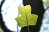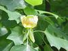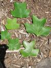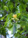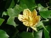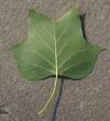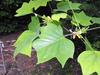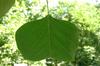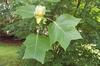 Liście mają długość 10–15 cm i szerokość 12–20 cm, są wykształcone w sposób wykluczający pomyłkę z innym gatunkiem (prócz tulipanowca chińskiego), w zarysie czworokątne i podzielone na cztery nierównej wielkości klapy, których wzdłużne brzegi przebiegają prawie równolegle do siebie. Liść jest z przodu jakby ucięty albo lekko wycięty. Jego górna powierzchnia jest błyszcząca, żywo zielona, a dolna nieco jaśniejsza i z lekka pokryta woskiem. Jesienią liście przebarwiają się na złotożółto. Ogonki liściowe od 10 do 12 cm długości.