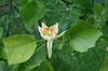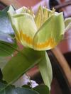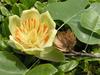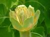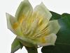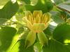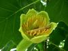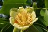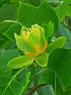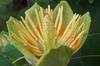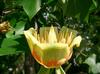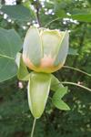 Kwiaty są obupłciowe i owadopylne. Rosną pojedynczo na końcach gałązek, przy rozkwitaniu początkowo kielichowate, potem szerzej rozwarte. Płatki u nasady żółtozielone, wyżej pomarańczowe, a na szczycie znów żółtozielone. Pręciki grube i mięsiste, mają 3–5 cm długości. Zalążnie skupione w środku na stożku. Kwitnienie zaczyna się już w kwietniu na południu Stanów Zjednoczonych, na północy zaś w czerwcu. W Polsce kwitnie na przełomie czerwca i lipca. Kwiaty tulipanowca są uważane za jedne z najprymitywniejszych wśród roślin okrytonasiennych. Cechuje je jednakowość płatków korony i działek kielicha, które są określane wspólnym mianem listków okwiatu, oraz świdrowate ułożenie wszystkich części kwiatu. Tulipanowiec jest ważnym miododajnym drzewem USA. Miód jest ciemnoczerwony, dobry jakościowo.