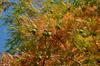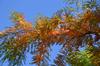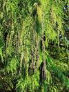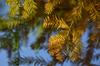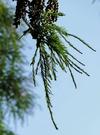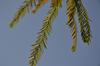 Liście na długopędach ustawione skrętolegle. Krótkopędy stojące pojedynczo mają około 10 cm długości. Dwurzędowo ułożone igły o długości do 2 cm są równowąskie i płaskie. Na początku listnienia przybierają żywą, jasnozieloną barwę, potem ciemnieją. Są zrzucane jesienią razem z krótkopędami.