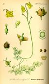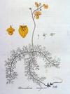 Liście o jajowatym kształcie, głęboko 3-5 dzielne. Mają długość 8 cm. Ich odcinki są nitkowate i z rzadka szczeciniasto owłosione.