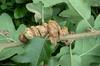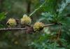 Owoce żołędzie dojrzewają dopiero w drugim roku. Owalne, 2,5 cm długości, brązowe osadzone w zdrewniałej miseczce pokrytej włosowatymi łuskami.