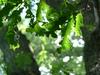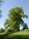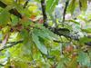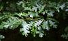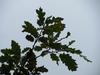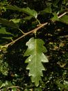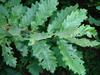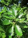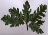 Liście długości 8-11 cm, szerokości około 5 cm. Podłużne, z wrębami, mają ogonki długości 2,5 cm, opadają na zimę. Na obu końcach równomiernie klinowato zwężone, po obu stronach z siedmioma - dziewięcioma niejednakowej wielkości klapami, rozdzielonymi przez ostro zbiegające zatoki. Blaszki liścia zwykle tylko do połowy wcięte. Klapy okrągławe lub delikatnie zaostrzone, z małym ząbkiem na szczycie. Często jednak całkiem tępe. Wierzchnia strona liścia jest ciemnozielona i błyszcząca (młode liście są szorstkie i lekko owłosione). Spodnia jaśniejsza i pokryta miękkim meszkiem, który utrzymuje się przez cały okres wegetacyjny.