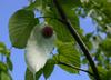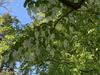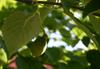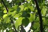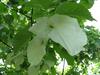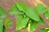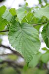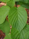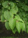 Liście opadające na zimę, skrętoległe. Osadzone na czerwonych ogonkach o długości od 3,5 do 7 cm. Blaszka liściowa jasnozielona, błyszcząca, szeroka, okrągłojajowata, u nasady sercowata, na szczycie zaostrzona, na brzegu ząbkowano-piłkowana. Osiąga 8-15 długości i 7-12 cm szerokości. Od spodu liście są gęsto owłosione, z wyraźnym użyłkowaniem.