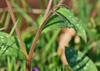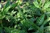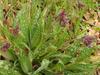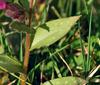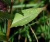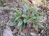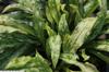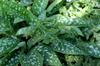 Liście dojrzałe liście odziomkowe są nieco szorstkie, mierzą 20–55 cm długości i 2,5–5,5 cm szerokości, pokryte są białymi lub bladozielonymi plamkami na górnej powierzchni, mają wąsko lancetowaty kształt, z nasadą powoli zbiegającą po ogonku i spiczastym wierzchołkiem. Blaszka liściowa jest 6–9 razy dłuższa niż szeroka, po obu stronach mniej lub bardziej pokryta gruczołami. Ogonek liściowy jest skrzydlaty, krótszy niż blaszka. Liści łodygowych jest 7–9, są siedzące (nasadą w połowie obejmujące łodygę), mają jajowato lancetowaty kształt ze spiczastym wierzchołkiem, mierzą 5,3–6,7 (maksymalnie 8,1) cm długości i 2,1 cm szerokości.
