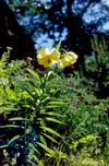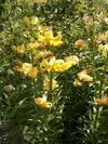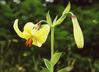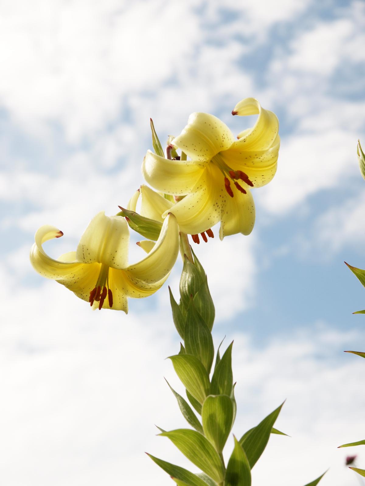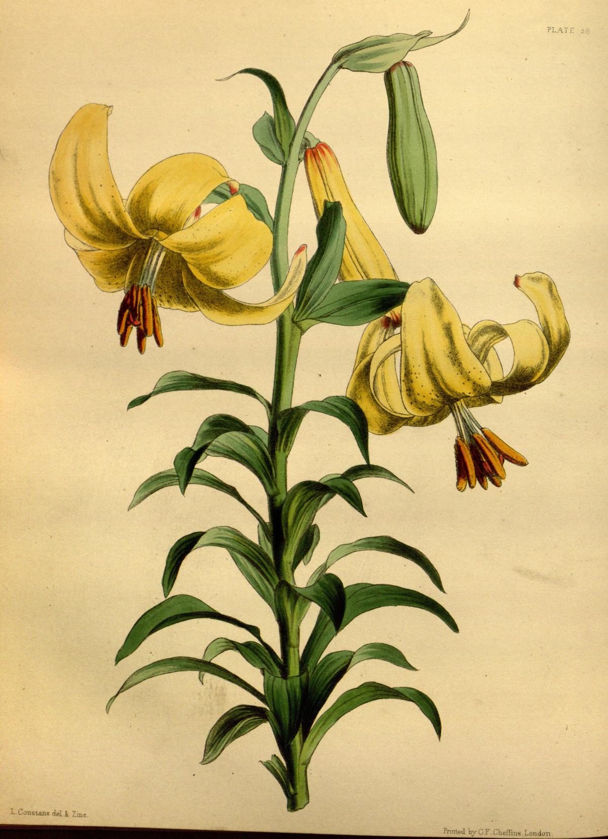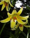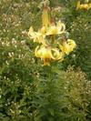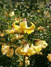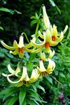 Kwiaty kwiatostan składa się z 1–5(20) zwieszonych, pachnących kwiatów. Niezróżnicowany na kielich i koronę okwiat składa się z sześciu żółtych, zwykle wewnątrz purpurowo lub kasztanowo nakrapianych, a na zewnątrz u nasady purpurowobrązowo nabiegłych, w różnym stopniu odgiętych na zewnątrz listków, mierzących 6–10 cm na 1–2 cm. Pręciki zrośnięte nitkami u nasady, z brązowymi lub kasztanowymi pylnikami o długości 8–13 mm, z pomarańczowym lub żółtym pyłkiem.