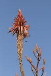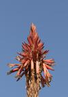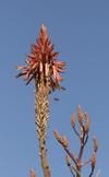 Pokrój ma krzewiasty – rozgałęzione, drewniejące pędy osiągają do 5 m wysokości i zakończone są rozetami szarozielonych liści. Rośliny uprawiane w klimacie umiarkowanym (m.in. w Polsce) osiągają do 1 m wysokości. Szarozielone liście na brzegu uzbrojone są w jasne ząbki oraz w ponad 98% zbudowane są z wody. Kwitnie w miesiącach chłodnych (na półkuli południowej od maja do lipca) tworząc okazałe kwiatostany z kwiatami w kolorze ciemnopomarańczowym, rzadko żółte, czerwone lub dwubarwne. Aloes drzewiasty to roślina zawsze zielona.