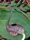 Kwiaty roślina jednopienna. Pojedynczy kwiatostan, typu pseudancjum, składa się z położonej poziomo, przylegającej do podłoża pochwy okrywającej kolbę. Pochwa jest w kolorze zielonym z czerwono-purpurowymi plamami i kończy się wąskim, haczykowatym wierzchołkiem. Pokryta podobnymi do włosków strukturami gruczołowymi kolba jest przyczepiona do wewnętrznej ściany pochwy, tworząc dwie podłużne komory oddzielające kwiaty męskie (w dolnej komorze) od pojedynczego kwiatu żeńskiego w górnej, otwartej komorze. Kwiaty położone są po przeciwnych stronach kolby. Kwiat żeński składa się z jednego owocolistka; długa szyjka słupka jest położona zgodnie z kierunkiem osi kolby; w pojedynczej komorze zalążni słupka znajduje się wiele zalążków. Kwiaty męskie składają się z od 16 do 24 pylników, ułożonych w mniej więcej dwóch podłużnych rzędach. Na powierzchni pylników znajdują się kuliste twory, wyglądające jak struktury gruczołowe, o nieznanej funkcji. W okresie kwitnienia, w czasie zrzucania pyłku, dyskoidalne znamię słupka ściśle przylega do powierzchni kolby. Pyłek wydostaje się przez wąskie szczeliny w ścianie pochwy.