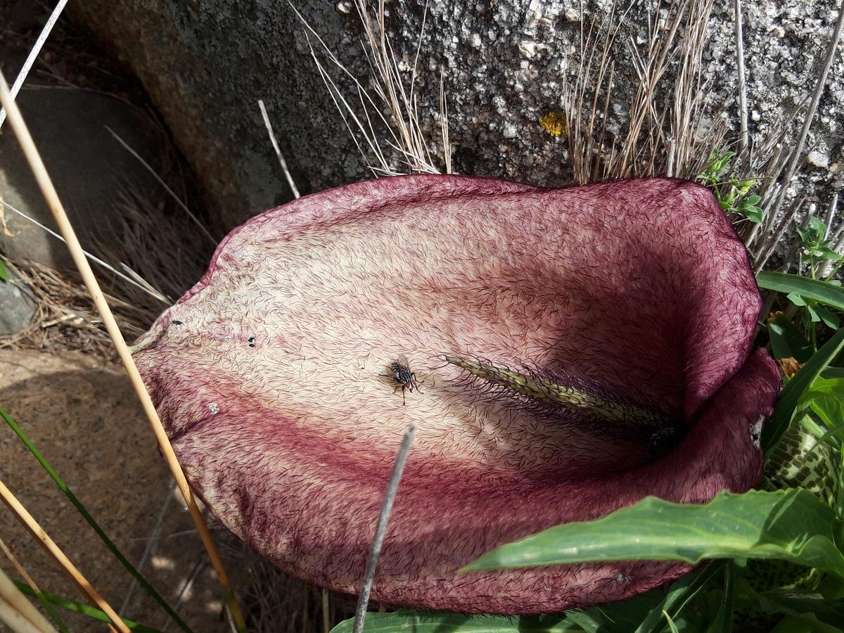 Rozwój Bylina, geofit. Bulwy rozwijają się głęboko wśród skał. Rośliny rozpoczynają okres wegetacyjny na przełomie stycznia i lutego, wyrastając przez szczeliny i pęknięcia skalne. Kwiatostan tworzy się na przełomie kwietnia i maja; z uwagi na swój rozmiar płoży się na skale. Jesienią części naziemne obumierają, a roślina wchodzi w stan spoczynku. Na dzień przed kwitnieniem kwiatostan rośliny lekko się rozluźnia, otwierając się całkowicie pierwszej nocy kwitnienia. Kolory pochwy są bardzo żywe, włoski podniesione, a wyrostek kolby przylega płasko do pochwy. Po wschodzie słońca pierwszego dnia kwitnienia kwiatostan zaczyna wydzielać bardzo silny odór przypominający ptasią padlinę (określany także jako zapach gnijących ryb, odchodów i kosza na śmieci), a temperatura wyrostka i kwiatów męskich podnosi się o około 10° – 15 °C powyżej temperatury powietrza. Kiedy słońce zaczyna bezpośrednio oświetlać kwiatostany, przyciągają do niego muchy z rodziny plujkowatych (przede wszystkim mucha plujka i Lucilia regalis) oraz zgniłówkowatych. Owady te lądują na pochwie, a część z nich przechodzi do podgrzanej komory w dolnej części kwiatostanu, gdzie zostaje uwięziona, z uwagi na wzniesione włoski zakrywające drogę wyjścia z komory. Jeżeli owady pokryte są pyłkiem innych roślin tego gatunku, zapylają kwiaty żeńskie. O poranku drugiego dnia kwitnienia kwiaty żeńskie stają się nieaktywne, a roślina wypuszcza pyłek, obsypując nim uwięzione w komorze muchy. Kwiatostan pozostaje otwarty, jego temperatura spada, pochwa zaczyna odstawać od wyrostka kolby, a włoski opadają, co pozwala odlecieć uwięzionym owadom. W kolejnych dniach brzegi pochwy zwijają się do góry, tworząc korytko wokół wyrostka, kolory kwiatostanu blakną, a roślina przestaje wydzielać zapach. Następnie zarówno pochwa, jak i wyrostek więdną. Maksymalny współczynnik oddechowy kwiatów męskich w czasie termogenezy, wynoszący 0,82 μmol CO2 s-1 g-1, może być najwyższym zarejestrowanym dla tkanek roślinnych. Roślina potrafi podnieść temperaturę kwiatostanu do 45 °C, a więc podobnej do temperatury mięśni owadów w trakcie lotu. Siedlisko Skaliste zbocza i klify na brzegu morza, na wysokości 25 – 250 m n.p.m. Prawie zawsze występują w pobliżu kolonii mew. Muchy związane z tymi koloniami są głównymi zapylaczami tych roślin. Genetyka Liczba chromosomów 2n = 56.