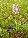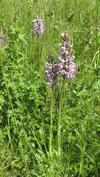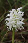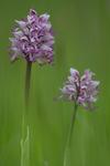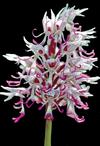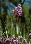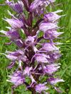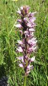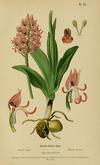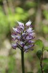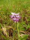 Jest to wieloletnia roślina o dwóch podziemnych jajowatych bulwach i łodydze o długość od 20 do 40 cm. Liście odziomkowe, równowąskie i odwrotnie lancetowate, od 5 do 12 cm długości; liście łodygowe obejmujące łodygę, zmniejszające się stopniowo idąc ku górze. Kwiatostan – gęsty, walcowaty, długości do 8 cm, złożony z licznych kwiatów zmiennie ubarwionych od koloru jasnego różu do purpury. Boczne zewnętrzne działki okwiatu owalnie lancetowate, zaostrzone, o długości ok. 1 cm. Środkowe i wewnętrzne działki tworzą rodzaj hełmu. Trójłatkowa warżka o dwóch wąskich łatkach bocznych i łatce środkowej, dzielącej się dalej na dwie długie, wąskie, lekko wzniesione ku górze łatki oraz delikatną łatkę środkową. Obrys całej warżki przypomina kształtem małpę, skąd nazwa gatunku. Biaława ostroga zgięta ku dołowi.